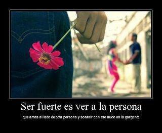 SE NECESITA MUCHA FUERZA DE VOLUNTAD Y MUCHO AMOR POR ESA PERSONA PARA SER CAPAZ DE VERLE SONREÍR A OTRA Y PENSAR QUE ELLA SI LE DARÁ LA FELICIDAD QUE QUIZÁS NO ENCONTRÓ EN MI... LE FALLÉ A SU AMOR... NO, TODO LE DÍ... PERO ÉL ES FELIZ Y SI NO SOY YO EL MOTIVO AUN ASÍ ME ALEGRA...